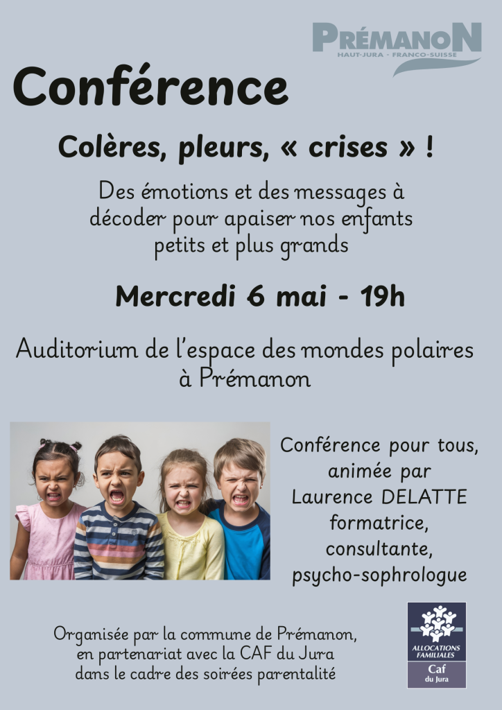 La commune de Prémanon organise dans le cadre du REAAP (Réseau d’appui et d’accompagnement à la parentalité cofinancé par la CAF) une conférence animée par Laurence DELATTE sur les émotions des enfants: